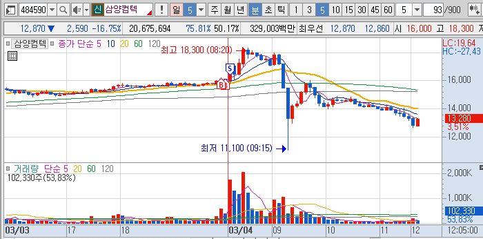 수급은 그닥 좋아보이지는 않았지만, 다른 매매자들도 딱히 들어갈만한 종목이 없을 것 같았고, 그나마 유일하게 들어갈 수 있는 종목이 삼양컴텍이라고 생각하여 매수